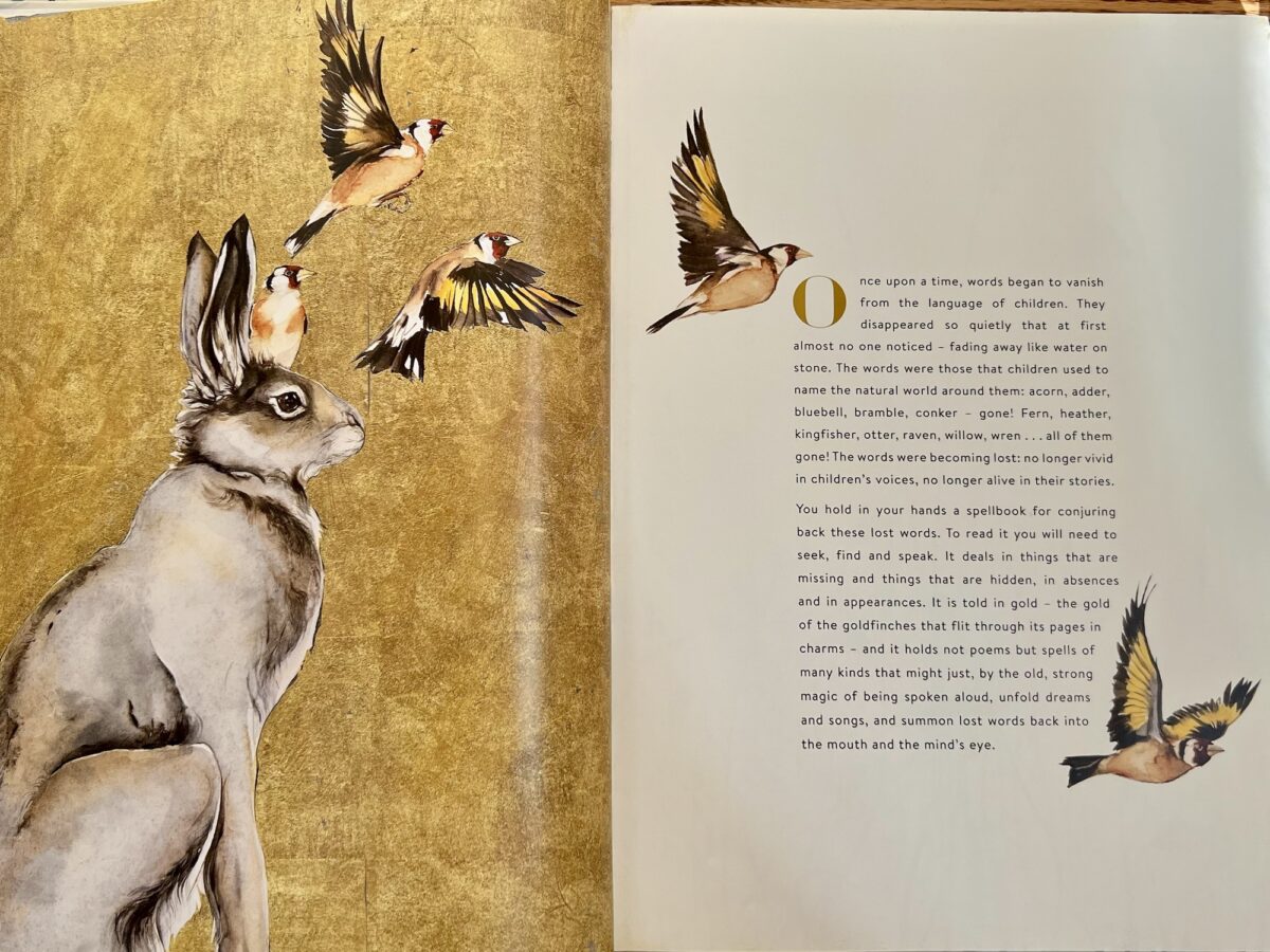 You hold in your hands a spellbook for conjuring back these lost words. To read it you will need to seek, find and speak. It deals in things that are missing and things that are hidden, in absences and in appearances. It is told in gold – the gold of the goldfinches that flit through its pages in charms – and it holds not poems but spells of many kinds that might just, by the old, strong magic of being spoken aloud, unfold dreams and songs, and summon lost words back into the mouth and the mind’s eye.